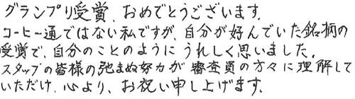 全国の食の専門家、23,000人が評価に参加する日本最大級の食品審査制度「ジャパンフードセレクション」。当店の「甘いブレンド」が最高位のグランプリを受賞いたしました。多くの専門家に認められた一杯です。
